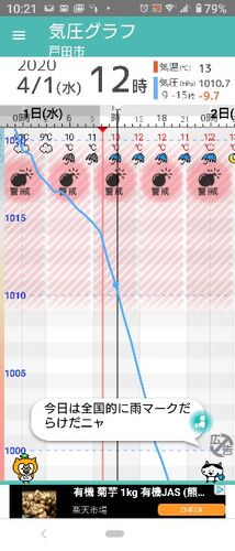 今日も急降下で気圧が下がってます 昨晩から明日の朝方までの予定ですか はみ出てしまうほどのグラフですね・・・・・その影響なのでしょうか いつもおしっこしたくなるとママに合図を送る栗たん 合図に応えて起こしてあげると上手にしっこしてくれます昨晩…